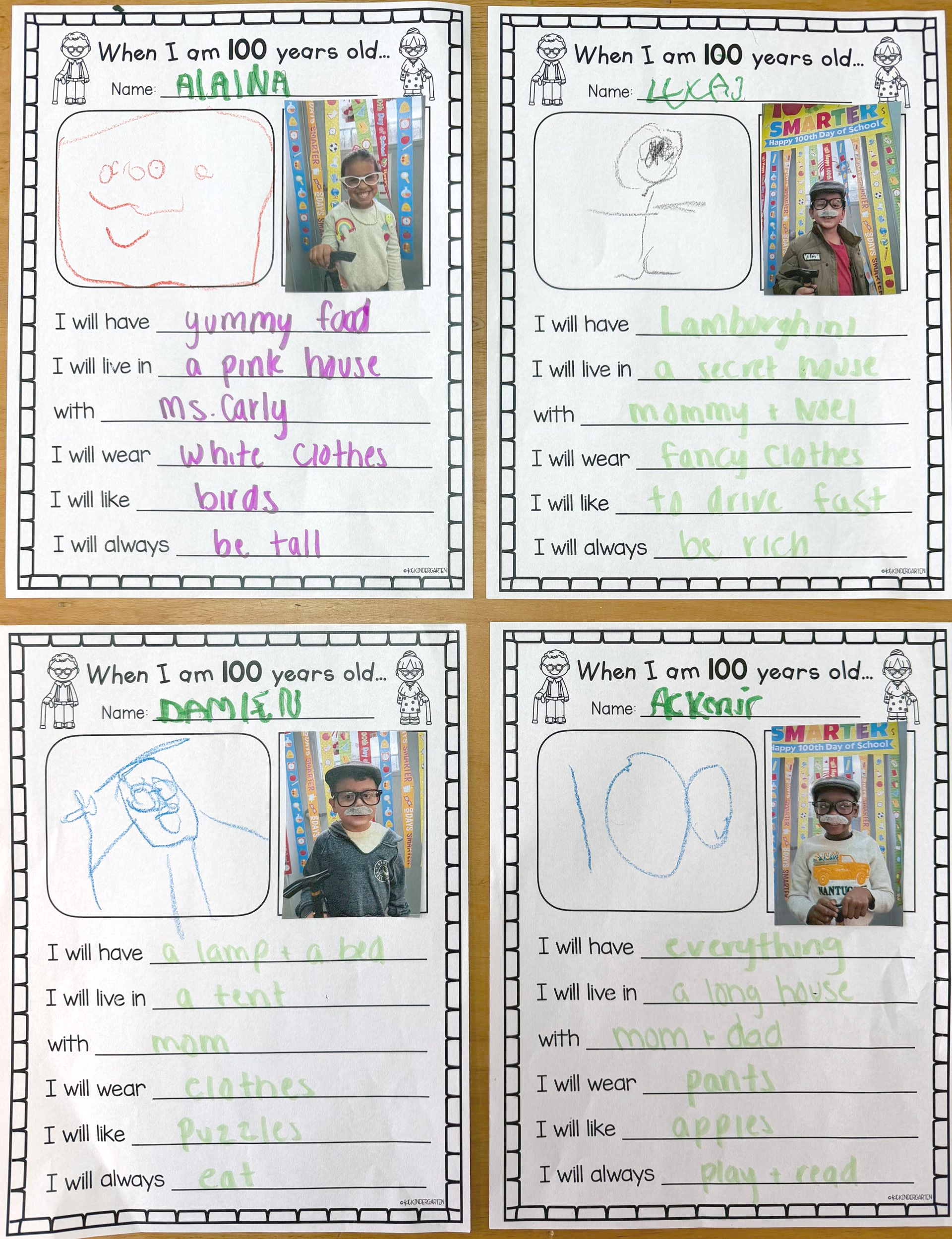 Dressed in hair rollers, cat-eye glasses, and greying mustaches, our preschool kids spent the day imagining what their future will look like when they’re 100 years old. Our car aficionado, Lucas, says that he sees a Lamborghini in his future, while Alaina looks forward to finally being tall. Damien looks forward to having a lamp and a bed in the tent that he’ll live with. Now we know who to get in touch with if the world goes off-grid.